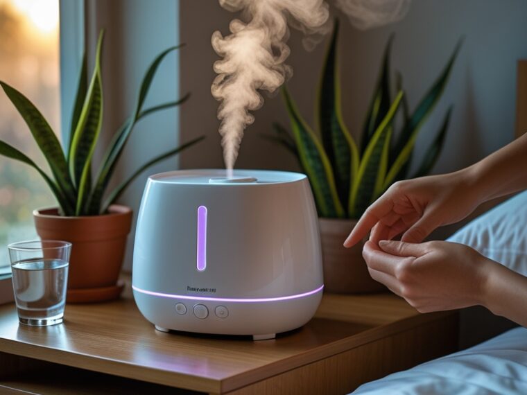 - postaw go na stoliku nocnym 30–50 cm od głowy i 50 cm od nawilżacza,